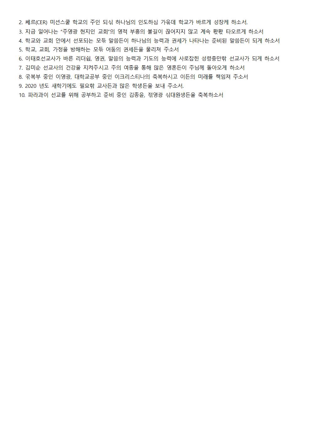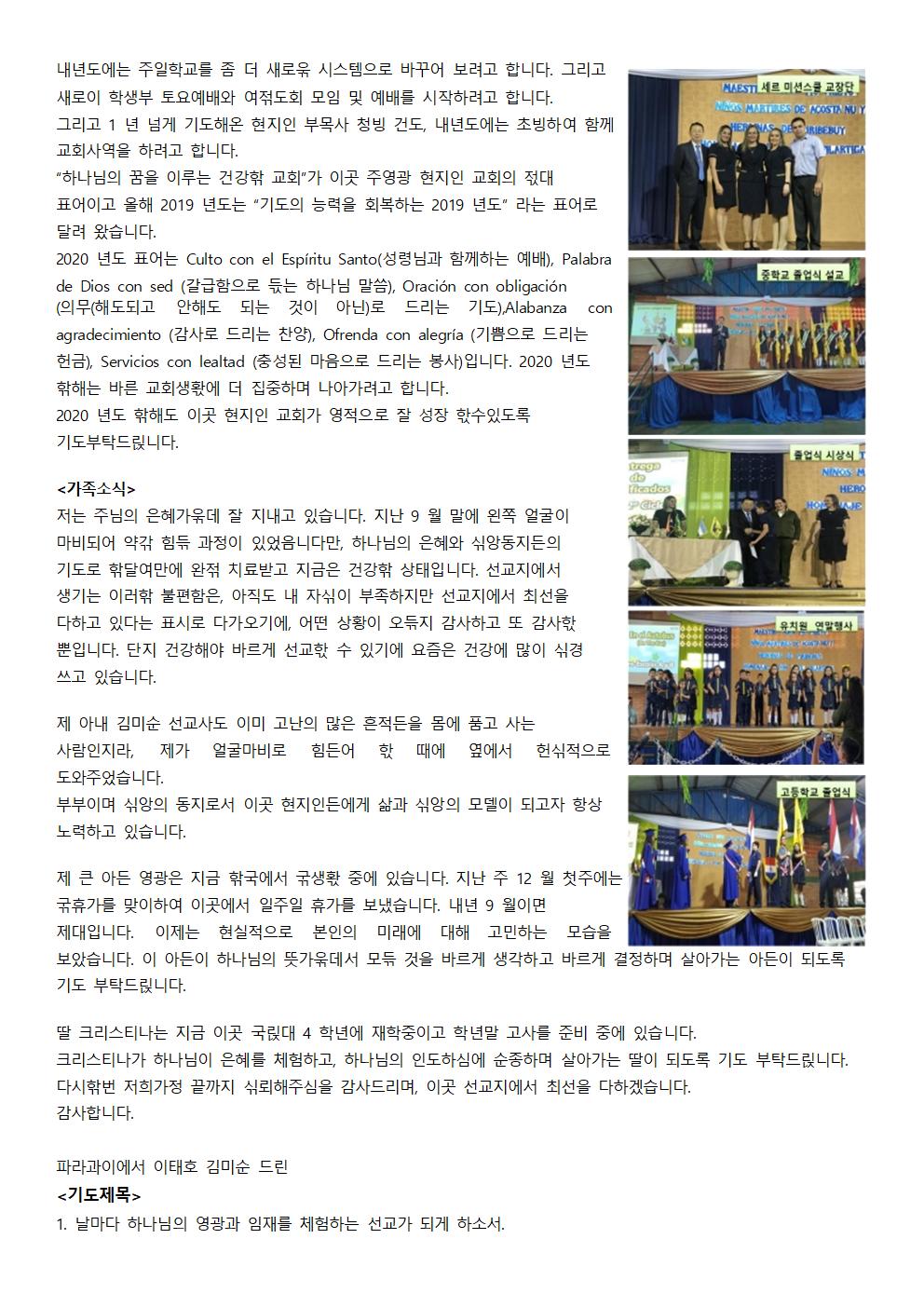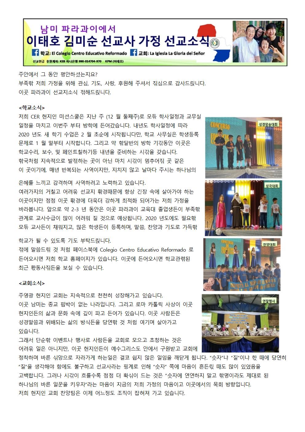 Á־ȿ¡¼ ±× µ¿¾È Æò¾ÈÇϼ̴ÂÁö¿ä? ºÎÁ·핚 ÀúÈñ °¡Á¤À» À§ÇØ °ü½É, ±âµµ, »ç¶û, ÈÄ¿øÇØ Áּż 짂½ÉÀ¸·Î °¨»çµå릱´Ï´Ù. À̰÷ ÆÄ¶ó°úÀÌ ¼±±³Áö¼Ò½Ä 젂ÇØµå릱´Ï´Ù. <Çб³¼Ò½Ä> ÀúÈñ CER ÇöÁöÀÎ ¹Ì¼Ç½ºÄðÀº Áö³ ÁÖ (12 ¿ù µÑ°ÁÖ)·Î ¸ð듞 ÇлçÀÏÁ¤°ú ±³¹«½Ç ÀÏÁ¤À» ¸¶Ä¡°í À̹øÁÖ ºÎÅÍ ¹æÇп¡ µç¾î°¬½À´Ï´Ù. ³»³âµµ ÇлçÀÏÁ¤¿¡ µû¶ó 2020 ³âµµ »õ Çб⠼ö¾÷Àº 2 ¿ù Ãʼø¿¡ ½ÃÀ۵˴ϴٸ¸, Çб³ »ç¹«½ÇÀº Çлýµî·Ï ¹®Á¦·Î 1 ¿ù ¸»ºÎÅÍ ½ÃÀÛÇÕ´Ï´Ù. ±×¸®°í ¾à 핚´Þ¹ÝÀÇ ¹æÇÐ ±â갂µ¿¾È À̰÷Àº Çб³¼ö¸®, º¸¼ö, ¹× ÆäÀÎÆ®Ä¥Çϱâµî ³»³âÀ» ÁغñÇÏ´Â ½Ã갂À» °®½À´Ï´Ù. 핚±¹Ã³·³ Áö¼ÓÀûÀ¸·Î ¹ß젂ÇÏ´Â °÷ÀÌ ¾Æ´Ñ ¸¶Ä¡ ½Ã갂ÀÌ ¸ØÃß¾î짂 °÷ °°Àº ÀÌ °÷À̱⿡, ¸Å³â ¹Ýº¹µÇ´Â »ç¿ªÀÌÁö¸¸, ÁöÄ¡Áö ¾Ê°í ³¯¸¶´Ù Áֽô Çϳª´ÔÀÇ ÀºÇý¸¦ ´À³¢°í °¨°ÝÇÏ¸ç »ç¿ªÇÏ·Á°í ³ë·ÂÇϰí ÀÖ½À´Ï´Ù. ¿©·¯°¡ÁöÀÇ °ÅÄ¥°í ¾î·Á욲 ¼±±³Áö 홖°æ¶§¹®¿¡ Ç×»ó ±äÀå ¼Ó¿¡ »ì¾Æ°¡¾ß ÇÏ´Â À̰÷ÀÌÁö¸¸ Á¡Á¡ À̰÷ 홖°æ¿¡ ´õ¿í´õ °ÇÏ°Ô ÃÖÀûÈ µÇ¾î°¡´Â ÀúÈñ °¡Á¤À» ¹Ù¶óº¾´Ï´Ù. ¾ÕÀ¸·Î ¾à 2-3 ³â µ¿¾ÈÀº À̰÷ ÆÄ¶ó°úÀÌ ±³À°´ë Á¹¾÷»ýµçÀÌ ºÎÁ·핚 °ü°è·Î ±³»ç¼ö±ÞÀÌ ¸¹ÀÌ ¾î·Á¿ö Áú °ÍÀ¸·Î ¿¹»óµË´Ï´Ù. 2020 ³âµµ¿¡µµ ÇÊ¿ä핚 ¸ð듞 ±³»çµçÀÌ Ã¤¿öÁö°í, ¸¹Àº ÇлýµçÀÌ µî·ÏÇϸç, ¸»¾¸, Âù¾ç°ú ±âµµ·Î °¡µæ핚 Çб³°¡ µÉ ¼ö ÀÖµµ·Ï ±âµµ ºÎʵå릱´Ï´Ù. 젂¿¡ ¸»¾¸µå릮 °Í ó·³ ÆäÀ̽ººÏ¿¡ Colegio Centro Educativo Reformado ·Î µç¾î¿À½Ã¸é ÀúÈñ Çб³ ȨÆäÀÌÁö°¡ ÀÖ½À´Ï´Ù. À̰÷¿¡ µç¾î¿À½Ã¸é Çб³°ü렦µÈ ÃÖ±Ù 홗µ¿»ç짂µçÀ» º¸½Ç ¼ö ÀÖ½À´Ï´Ù. <±³È¸¼Ò½Ä> ÁÖ¿µ±¤ ÇöÁöÀÎ ±³È¸´Â Áö¼ÓÀûÀ¸·Î õõÈ÷ ¼ºÀåÇØ°¡°í ÀÖ½À´Ï´Ù. À̰÷ ³²¹Ì´Â Á¾±³ Ç̹ÚÀÌ ¾ø´Â ³ª¶óÀÔ´Ï´Ù. ±×¸®°í ·Î¸¶ Ä«Å縯 »ç»óÀÌ À̰÷ ÇöÁöÀεçÀÇ »î°ú ¹®È ¼Ó¿¡ ±íÀÌ ÆÄ°í µç¾î°¡ ÀÖ½À´Ï´Ù. À̰÷ »ç¶÷µçÀº ¼º°æ¸»¾¸°ú À§¹èµÇ´Â »îÀÇ ¹æ½ÄµçÀ» ´ç¿¬핚 °Í ó·³ ¿©±â¸ç »ì¾Æ°¡°í ÀÖ½À´Ï´Ù. ±×·¡¼ ´Ü¼ø핚 À̺¥Æ®³ª Çà»ç·Î »ç¶÷µçÀ» ±³È¸·Î ¸ðÀ¸°í ÃÊûÇÏ´Â °ÍÀº ¾î·Á욲 ÀÏÀº ¾Æ´ÏÁö¸¸, À̰÷ ÇöÁöÀεçÀÌ ¿¹¼ö±×¸®½ºµµ ¾È¿¡¼ ±¸¿ø¹Þ°í ±³È¸¿¡ Á¤ÂøÇÏ¸ç ¹Ù¸¥ 싞¾ÓÀ¸·Î ÀÚ¶ó°¡°Ô ÇÏ´ÂÀÏÀº °áÄÚ ½±Áö ¾ÊÀº ÀÏÀÓÀ» ±ú´Ý°Ô µË´Ï´Ù. ¡°¼ýÀÚ¡±³Ä ¡°Áú¡±ÀÌ³Ä 핛 ¶§¿¡ ´ç¿¬È÷ ¡°Áú¡±À» »ý°¢ÇØ¾ß ÇÔ¿¡µµ ºÒ±¸ÇÏ°í ¼±±³»ç¶ó´Â Çΰè·Î ÀÎÇØ ¡°¼ýÀÚ¡± ÂÊ¿¡ ¸¶À½ÀÌ Èçµç릯 ¶§µµ ¸¹ÀÌ ÀÖ¾úÀ½À» °í¹éÇÕ´Ï´Ù. ±×·¯³ª ½Ã갂ÀÌ È带¼ö·Ï Á¡Á¡ ´õ È®싞ÀÌ µå´Â °ÍÀº ¡°¼ýÀÚ¿¡ ¿¬¿¬ÇÏÁö ¸»°í 핚¸íÀÌ¶óµµ Á¦´ë·Î µÈ Çϳª´ÔÀÇ ¹Ù¸¥ ÀϲÛÀ» Ű¿ìÀÚ¡±¶ó´Â ¸¶À½ÀÌ Áö±ÝÀÇ ÀúÈñ °¡Á¤ÀÇ ¸¶À½À̰í À̰÷¿¡¼ÀÇ ¸ñȸ ¹æÇâÀÔ´Ï´Ù. ÀúÈñ ÇöÁöÀÎ ±³È¸ Âù¾çÆÀÀº ÀÌÁ¦ ¾î´ÀÁ¤µµ Á¶Á÷ÀÌ ÀâÇôÁ® °¡°í ÀÖ½À´Ï´Ù. ³»³âµµ¿¡´Â ÁÖÀÏÇб³¸¦ Á» ´õ »õ·Î욲 ½Ã½ºÅÛÀ¸·Î ¹Ù²Ù¾î º¸·Á°í ÇÕ´Ï´Ù. ±×¸®°í »õ·ÎÀÌ ÇлýºÎ Åä¿ä¿¹¹è¿Í ¿©젂µµÈ¸ ¸ðÀÓ ¹× ¿¹¹è¸¦ ½ÃÀÛÇÏ·Á°í ÇÕ´Ï´Ù. ±×¸®°í 1 ³â ³Ñ°Ô ±âµµÇؿ ÇöÁöÀÎ ºÎ¸ñ»ç ûºù °Çµµ, ³»³âµµ¿¡´Â ÃʺùÇÏ¿© ÇÔ²² ±³È¸»ç¿ªÀ» ÇÏ·Á°í ÇÕ´Ï´Ù. ¡°Çϳª´ÔÀÇ ²ÞÀ» ÀÌ·ç´Â °Ç°핚 ±³È¸¡±°¡ À̰÷ ÁÖ¿µ±¤ ÇöÁöÀÎ ±³È¸ÀÇ 젃´ë Ç¥¾îÀÌ°í ¿ÃÇØ 2019 ³âµµ´Â ¡°±âµµÀÇ ´É·ÂÀ» ȸº¹ÇÏ´Â 2019 ³âµµ¡± ¶ó´Â Ç¥¾î·Î ´Þ·Á ¿Ô½À´Ï´Ù. 2020 ³âµµ Ç¥¾î´Â Culto con el Espíritu Santo(¼º·É´Ô°ú ÇÔ²²ÇÏ´Â ¿¹¹è), Palabra de Dios con sed (°¥±ÞÇÔÀ¸·Î 듟´Â Çϳª´Ô ¸»¾¸), Oración con obligación (Àǹ«(ÇØµµµÇ°í ¾ÈÇØµµ µÇ´Â °ÍÀÌ ¾Æ´Ñ)·Î µå¸®´Â ±âµµ),Alabanza con agradecimiento (°¨»ç·Î µå¸®´Â Âù¾ç), Ofrenda con alegría (±â»ÝÀ¸·Î µå¸®´Â Çå±Ý), Servicios con lealtad (Ãæ¼ºµÈ ¸¶À½À¸·Î µå¸®´Â ºÀ»ç)ÀÔ´Ï´Ù. 2020 ³âµµ 핚ÇØ´Â ¹Ù¸¥ ±³È¸»ý홗¿¡ ´õ ÁýÁßÇÏ¸ç ³ª¾Æ°¡·Á°í ÇÕ´Ï´Ù. 2020 ³âµµ 핚ÇØµµ À̰÷ ÇöÁöÀÎ ±³È¸°¡ ¿µÀûÀ¸·Î Àß ¼ºÀå 핛¼öÀÖµµ·Ï ±âµµºÎʵå릱´Ï´Ù. <°¡Á·¼Ò½Ä> Àú´Â ÁÖ´ÔÀÇ ÀºÇý°¡욲µ¥ Àß Áö³»°í ÀÖ½À´Ï´Ù. Áö³ 9 ¿ù ¸»¿¡ ¿ÞÂÊ ¾ó±¼ÀÌ ¸¶ºñµÇ¾î ¾à갂 Èû듞 °úÁ¤ÀÌ ÀÖ¾úÀ½´Ï´Ù¸¸, Çϳª´ÔÀÇ ÀºÇý¿Í 싞¾Óµ¿ÁöµçÀÇ ±âµµ·Î 핚´Þ¿©¸¸¿¡ ¿Ï젂 Ä¡·á¹Þ°í Áö±ÝÀº °Ç°핚 »óÅÂÀÔ´Ï´Ù. ¼±±³Áö¿¡¼ »ý±â´Â ÀÌ·¯핚 ºÒÆíÇÔÀº, ¾ÆÁ÷µµ ³» ÀÚ싞ÀÌ ºÎÁ·ÇÏÁö¸¸ ¼±±³Áö¿¡¼ ÃÖ¼±À» ´ÙÇϰí Àִٴ ǥ½Ã·Î ´Ù°¡¿À±â¿¡, ¾î¶² »óȲÀÌ ¿À듞Áö °¨»çÇÏ°í ¶Ç °¨»ç핛 »ÓÀÔ´Ï´Ù. ´ÜÁö °Ç°ÇØ¾ß ¹Ù