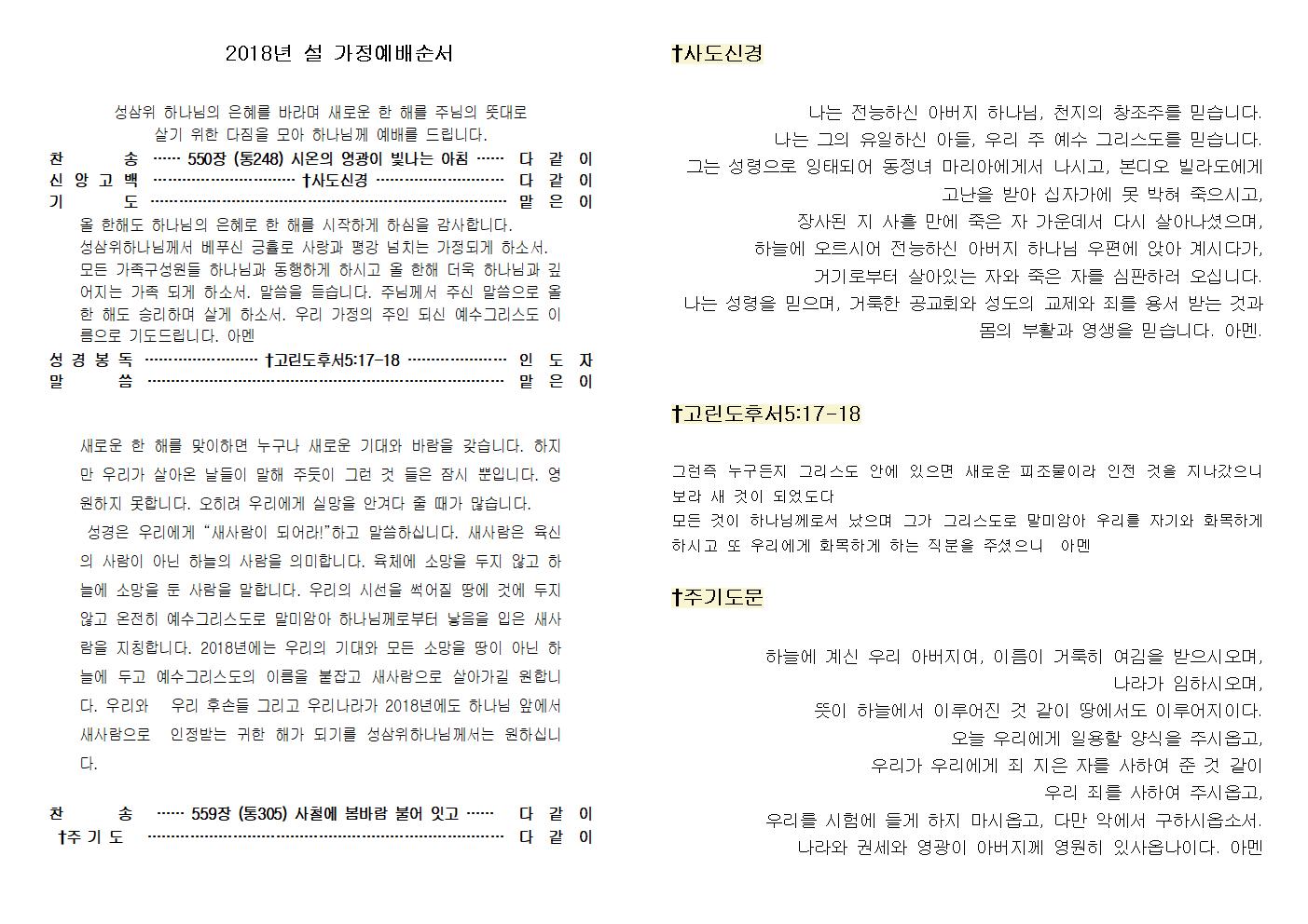 ¼º»ïÀ§ Çϳª´ÔÀÇ ÀºÇý¸¦ ¹Ù¶ó¸ç »õ·Î¿î ÇÑ ÇØ¸¦ ÁÖ´ÔÀÇ ¶æ´ë·Î »ì±â À§ÇÑ ´ÙÁüÀ» ¸ð¾Æ Çϳª´Ô²² ¿¹¹è¸¦ µå¸³´Ï´Ù. Âù ¼Û ¡¦¡¦ 550Àå (Åë248) ½Ã¿ÂÀÇ ¿µ±¤ÀÌ ºû³ª´Â ¾ÆÄ§ ¡¦¡¦ ´Ù°°ÀÌ ½Å¾Ó°í¹é ¡¦¡¦¡¦¡¦¡¦¡¦¡¦¡¦¡¦¡¦ ¢Ó»çµµ½Å°æ ¡¦¡¦¡¦¡¦¡¦¡¦¡¦¡¦¡¦ ´Ù°°ÀÌ ±â µµ ¡¦¡¦¡¦¡¦¡¦¡¦¡¦¡¦¡¦¡¦¡¦¡¦¡¦¡¦¡¦¡¦¡¦¡¦¡¦¡¦¡¦¡¦¡¦¡¦¡¦ ¸ÃÀºÀÌ ¿Ã ÇÑÇØµµ Çϳª´ÔÀÇ ÀºÇý·Î ÇÑ ÇØ¸¦ ½ÃÀÛÇÏ°Ô ÇϽÉÀ» °¨»çÇÕ´Ï´Ù. ¼º»ïÀ§Çϳª´Ô²²¼ º£Çª½Å ±àÈá·Î »ç¶û°ú Æò° ³ÑÄ¡´Â °¡Á¤µÇ°Ô ÇϼҼ. ¸ðµç °¡Á·±¸¼º¿øµé Çϳª´Ô°ú µ¿ÇàÇÏ°Ô ÇÏ½Ã°í ¿Ã ÇÑÇØ ´õ¿í Çϳª´Ô°ú ±í¾îÁö´Â °¡Á· µÇ°Ô ÇϼҼ. ¸»¾¸À» µè½À´Ï´Ù. ÁÖ´Ô²²¼ ÁֽЏ»¾¸À¸·Î ¿Ã ÇÑ ÇØµµ ½Â¸®ÇÏ¸ç »ì°Ô ÇϼҼ. ¿ì¸® °¡Á¤ÀÇ ÁÖÀÎ µÇ½Å ¿¹¼ö±×¸®½ºµµ À̸§À¸·Î ±âµµµå¸³´Ï´Ù. ¾Æ¸à ¼º°æºÀµ¶ ¡¦¡¦¡¦¡¦¡¦¡¦¡¦¡¦ ¢Ó°í¸°µµÈļ5:17-18 ¡¦¡¦¡¦¡¦¡¦¡¦¡¦ ÀεµÀÚ ¸» ¾¸ ¡¦¡¦¡¦¡¦¡¦¡¦¡¦¡¦¡¦¡¦¡¦¡¦¡¦¡¦¡¦¡¦¡¦¡¦¡¦¡¦¡¦¡¦¡¦¡¦¡¦ ¸ÃÀºÀÌ »õ·Î¿î ÇÑ ÇØ¸¦ ¸ÂÀÌÇÏ¸é ´©±¸³ª »õ·Î¿î ±â´ë¿Í ¹Ù¶÷À» °®½À´Ï´Ù. ÇÏÁö¸¸ ¿ì¸®°¡ »ì¾Æ¿Â ³¯µéÀÌ ¸»ÇØ ÁÖµíÀÌ ±×·± °Í µéÀº Àá½Ã »ÓÀÔ´Ï´Ù. ¿µ¿øÇÏÁö ¸øÇÕ´Ï´Ù. ¿ÀÈ÷·Á ¿ì¸®¿¡°Ô ½Ç¸ÁÀ» ¾È°Ü´Ù ÁÙ ¶§°¡ ¸¹½À´Ï´Ù. ¼º°æÀº ¿ì¸®¿¡°Ô ¡°»õ»ç¶÷ÀÌ µÇ¾î¶ó!¡±ÇÏ°í ¸»¾¸ÇϽʴϴÙ. »õ»ç¶÷Àº À°½ÅÀÇ »ç¶÷ÀÌ ¾Æ´Ñ ÇÏ´ÃÀÇ »ç¶÷À» ÀǹÌÇÕ´Ï´Ù. À°Ã¼¿¡ ¼Ò¸ÁÀ» µÎÁö ¾Ê°í Çϴÿ¡ ¼Ò¸ÁÀ» µÐ »ç¶÷À» ¸»ÇÕ´Ï´Ù. ¿ì¸®ÀÇ ½Ã¼±À» ½â¾îÁú ¶¥¿¡ °Í¿¡ µÎÁö ¾Ê°í ¿ÂÀüÈ÷ ¿¹¼ö±×¸®½ºµµ·Î ¸»¹Ì¾Ï¾Æ Çϳª´Ô²²·ÎºÎÅÍ ³ºÀ½À» ÀÔÀº »õ»ç¶÷À» ÁöĪÇÕ´Ï´Ù. 2018³â¿¡´Â ¿ì¸®ÀÇ ±â´ë¿Í ¸ðµç ¼Ò¸ÁÀ» ¶¥ÀÌ ¾Æ´Ñ Çϴÿ¡ µÎ°í ¿¹¼ö±×¸®½ºµµÀÇ À̸§À» ºÙÀâ°í »õ»ç¶÷À¸·Î »ì¾Æ°¡±æ ¿øÇÕ´Ï´Ù. ¿ì¸®¿Í ¿ì¸® ÈÄ¼Õµé ±×¸®°í ¿ì¸®³ª¶ó°¡ 2018³â¿¡µµ Çϳª´Ô ¾Õ¿¡¼ »õ»ç¶÷À¸·Î ÀÎÁ¤¹Þ´Â ±ÍÇÑ ÇØ°¡ µÇ±â¸¦ ¼º»ïÀ§Çϳª´Ô²²¼´Â ¿øÇϽʴϴÙ.