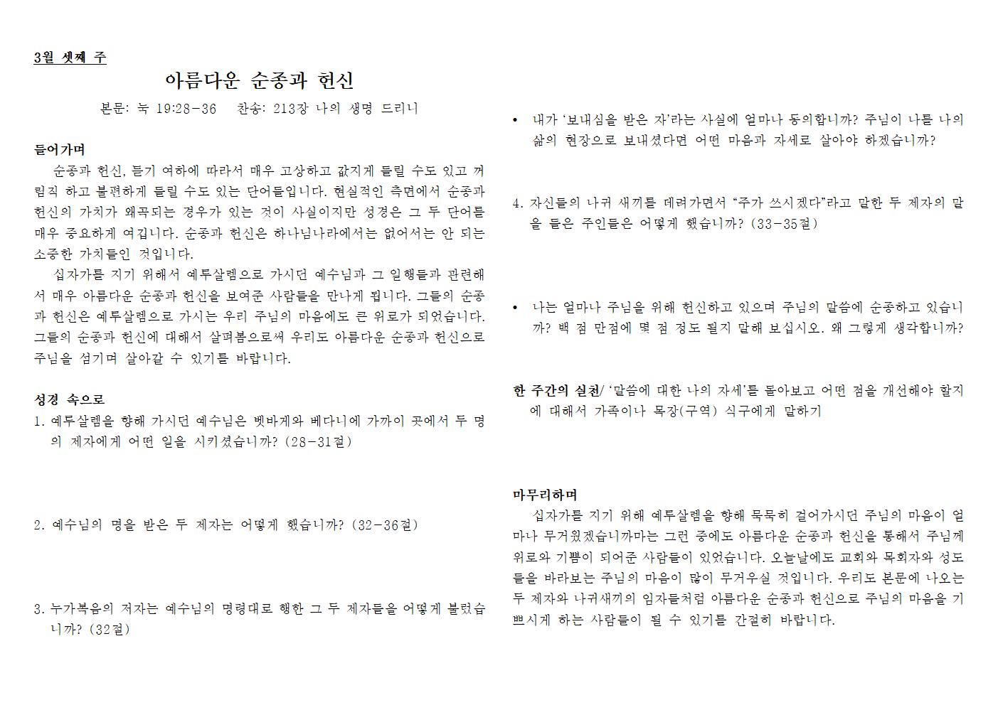 3¿ù ¼Â° ÁÖ ¾Æ¸§´Ù¿î ¼øÁ¾°ú Çå½Å º»¹®: ´ª 19:28-36 Âù¼Û: 213Àå ³ªÀÇ »ý¸í µå¸®´Ï µé¾î°¡¸ç ¼øÁ¾°ú Çå½Å, µè±â ¿©ÇÏ¿¡ µû¶ó¼ ¸Å¿ì °í»óÇÏ°í °ªÁö°Ô µé¸± ¼öµµ ÀÖ°í ²¨¸²Á÷ ÇÏ°í ºÒÆíÇÏ°Ô µé¸± ¼öµµ ÀÖ´Â ´Ü¾îµéÀÔ´Ï´Ù. Çö½ÇÀûÀÎ Ãø¸é¿¡¼ ¼øÁ¾°ú Çå½ÅÀÇ °¡Ä¡°¡ ¿Ö°îµÇ´Â °æ¿ì°¡ ÀÖ´Â °ÍÀÌ »ç½ÇÀÌÁö¸¸ ¼º°æÀº ±× µÎ ´Ü¾î¸¦ ¸Å¿ì Áß¿äÇÏ°Ô ¿©±é´Ï´Ù. ¼øÁ¾°ú Çå½ÅÀº Çϳª´Ô³ª¶ó¿¡¼´Â ¾ø¾î¼´Â ¾È µÇ´Â ¼ÒÁßÇÑ °¡Ä¡µéÀÎ °ÍÀÔ´Ï´Ù. ½ÊÀÚ°¡¸¦ Áö±â À§Çؼ ¿¹·ç»ì·½À¸·Î °¡½Ã´ø ¿¹¼ö´Ô°ú ±× ÀÏÇàµé°ú °ü·ÃÇØ¼ ¸Å¿ì ¾Æ¸§´Ù¿î ¼øÁ¾°ú Çå½ÅÀ» º¸¿©ÁØ »ç¶÷µéÀ» ¸¸³ª°Ô µË´Ï´Ù. ±×µéÀÇ ¼øÁ¾°ú Çå½ÅÀº ¿¹·ç»ì·½À¸·Î °¡½Ã´Â ¿ì¸® ÁÖ´ÔÀÇ ¸¶À½¿¡µµ Å« À§·Î°¡ µÇ¾ú½À´Ï´Ù. ±×µéÀÇ ¼øÁ¾°ú Çå½Å¿¡ ´ëÇØ¼ »ìÆìº½À¸·Î½á ¿ì¸®µµ ¾Æ¸§´Ù¿î ¼øÁ¾°ú Çå½ÅÀ¸·Î ÁÖ´ÔÀ» ¼¶±â¸ç »ì¾Æ°¥ ¼ö Àֱ⸦ ¹Ù¶ø´Ï´Ù. ¼º°æ ¼ÓÀ¸·Î 1. ¿¹·ç»ì·½À» ÇâÇØ °¡½Ã´ø ¿¹¼ö´ÔÀº ºª¹Ù°Ô¿Í º£´Ù´Ï¿¡ °¡±îÀÌ °÷¿¡¼ µÎ ¸íÀÇ Á¦ÀÚ¿¡°Ô ¾î¶² ÀÏÀ» ½ÃŰ¼Ì½À´Ï±î? (28-31Àý) 2. ¿¹¼ö´ÔÀÇ ¸íÀ» ¹ÞÀº µÎ Á¦ÀÚ´Â ¾î¶»°Ô Çß½À´Ï±î? (32-36Àý) 3. ´©°¡º¹À½ÀÇ ÀúÀÚ´Â ¿¹¼ö´ÔÀÇ ¸í·É´ë·Î ÇàÇÑ ±× µÎ Á¦ÀÚµéÀ» ¾î¶»°Ô ºÒ·¶½À´Ï±î? (32Àý) ³»°¡ ¡®º¸³»½ÉÀ» ¹ÞÀº ÀÚ¡¯¶ó´Â »ç½Ç¿¡ ¾ó¸¶³ª µ¿ÀÇÇմϱî? ÁÖ´ÔÀÌ ³ª¸¦ ³ªÀÇ »îÀÇ ÇöÀåÀ¸·Î º¸³»¼Ì´Ù¸é ¾î¶² ¸¶À½°ú ÀÚ¼¼·Î »ì¾Æ¾ß ÇϰڽÀ´Ï±î? 4. ÀڽŵéÀÇ ³ª±Í »õ³¢¸¦ µ¥·Á°¡¸é¼ ¡°ÁÖ°¡ ¾²½Ã°Ú´Ù¡±¶ó°í ¸»ÇÑ µÎ Á¦ÀÚÀÇ ¸»À» µéÀº ÁÖÀεéÀº ¾î¶»°Ô Çß½À´Ï±î? (33-35Àý) ³ª´Â ¾ó¸¶³ª ÁÖ´ÔÀ» À§ÇØ Çå½ÅÇϰí ÀÖÀ¸¸ç ÁÖ´ÔÀÇ ¸»¾¸¿¡ ¼øÁ¾Çϰí ÀÖ½À´Ï±î? ¹é Á¡ ¸¸Á¡¿¡ ¸î Á¡ Á¤µµ µÉÁö ¸»ÇØ º¸½Ê½Ã¿À. ¿Ö ±×·¸°Ô »ý°¢Çմϱî? ÇÑ ÁÖ°£ÀÇ ½Çõ/ ¡®¸»¾¸¿¡ ´ëÇÑ ³ªÀÇ ÀÚ¼¼¡¯¸¦ µ¹¾Æº¸°í ¾î¶² Á¡À» °³¼±ÇØ¾ß ÇÒÁö¿¡ ´ëÇØ¼ °¡Á·À̳ª ¸ñÀå(±¸¿ª) ½Ä±¸¿¡°Ô ¸»Çϱ⠸¶¹«¸®ÇÏ¸ç ½ÊÀÚ°¡¸¦ Áö±â À§ÇØ ¿¹·ç»ì·½À» ÇâÇØ ¹¬¹¬È÷ °É¾î°¡½Ã´ø ÁÖ´ÔÀÇ ¸¶À½ÀÌ ¾ó¸¶³ª ¹«°Å¿ü°Ú½À´Ï±î¸¶´Â ±×·± Áß¿¡µµ ¾Æ¸§´Ù¿î ¼øÁ¾°ú Çå½ÅÀ» ÅëÇØ¼ ÁÖ´Ô²² À§·Î¿Í ±â»ÝÀÌ µÇ¾îÁØ »ç¶÷µéÀÌ ÀÖ¾ú½À´Ï´Ù. ¿À´Ã³¯¿¡µµ ±³È¸¿Í ¸ñȸÀÚ¿Í ¼ºµµµéÀ» ¹Ù¶óº¸´Â ÁÖ´ÔÀÇ ¸¶À½ÀÌ ¸¹ÀÌ ¹«°Å¿ì½Ç °ÍÀÔ´Ï´Ù. ¿ì¸®µµ º»¹®¿¡ ³ª¿À´Â µÎ Á¦ÀÚ¿Í ³ª±Í»õ³¢ÀÇ ÀÓÀÚµéó·³ ¾Æ¸§´Ù¿î ¼øÁ¾°ú Çå½ÅÀ¸·Î ÁÖ´ÔÀÇ ¸¶À½À» ±â»Ú½Ã°Ô ÇÏ´Â »ç¶÷µéÀÌ µÉ ¼ö Àֱ⸦ °£ÀýÈ÷ ¹Ù¶ø´Ï´Ù.