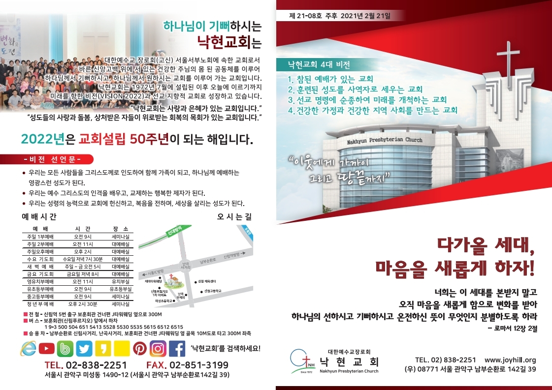 ¡Ø ±¤ °í 1. °æ°ÇÀÇ »î *. °æ°ÇÀÇ »îÀ» ÅëÇØ °³ÀÎÀÇ ½Å¾ÓÀ» Àß ÁöÄÑ °¡½Ã±â ¹Ù¶ø´Ï´Ù. (°æ°Ç Ä«µå´Â Çʰæ´ë À§¿¡ ÀÖ½À´Ï´Ù.) 2. 2021³â ¸ñȸ ÁßÁ¡ »çÇ× *. Ç¥¾î : ´Ù°¡¿Ã ¼¼´ë, ¸¶À½À» »õ·Ó°Ô ÇÏÀÚ(·Ò12:2) *. ¿¹¹è¸¦ À§ÇÑ ±âµµÆ¯°ø´ë ¿î¿µ(¸ðÁý : »ç¹«½Ç·Î ¹®ÀÇ) *. ¸Å¿ù ù ÁÖÀÏ ¼ºÂù½Ä ½ÃÇà *. ±³È¸ ¼³¸³ 50Áֳ⠱â³ä Áغñ (½ÉÀ庴 ¾î¸°ÀÌ ¼ö¼úºñ Áö¿ø µ¿Àü ¸ðÀ¸±â, Àü±³ÀÎ ¼º°æÇÊ»ç) *. µ¿Àü ¸ðÀ¸±â Àú±ÝÅë °¡Á®°¡½Ã±â ¹Ù¶ø´Ï´Ù. *. ¼º°æÇÊ»ç Áö¿øÀº »ç¹«½Ç·Î ÇϽñ⠹ٶø´Ï´Ù. 3. ¿¹, °á»ê ´çȸ °áÁ¤»çÇ× *. ¿À´Ã ¿¹¹è Áß¿¡ °øÆ÷ÇÕ´Ï´Ù. *. 2020³â °¨»çº¸°íµµ ÀÖ½À´Ï´Ù. 4. ¿ÀÈÄ ¿¹¹è *. ¿ÀÈÄ ¿¹¹è ½Ã¿¡ ¸ñÀå ¸ðÀÓµµ °âÇÕ´Ï´Ù. *. ÀÛÀº ¸ñÀڵ鲲¼´Â ¸ñÀå ¿øµéÀ» »ìÇǽðí, ¿¹¹è ÈÄ ¸ñÀå º°·Î ¸ðÀÓÀ» °¡Áö½Ã±â ¹Ù¶ø´Ï´Ù. 5. ¿¹¹è ¾È³» ¹× ¼öÄ¢ *. Äڷγª·Î ÀÎÇØ ÇÔ²² ÇÏ´Â ¿¹¹è¸¦ µå¸®Áö ¸øÇϰí ÀÖ½À´Ï´Ù. (Á¼®¼ö 20%) ¸ðµÎ°¡ ÇÔ²² ¿¹¹èÇÏ´Â ³¯ÀÌ ¿Àµµ·Ï ±âµµÇϽðí, Ȥ ±³È¸¿¡¼ ¿¹¹èÇϱ⸦ ¿øÇϽô ºÐµéÀº ±³È¸·Î ¿¬¶ôÇϽñ⠹ٶø´Ï´Ù. *. ¸ðµç ºÐµéÀÌ ¿¹¹èÇÒ ¼ö ÀÖµµ·Ï µ¹¾Æ°¡¸é¼ ¹èÁ¤ÇÒ ¿¹Á¤ÀÔ´Ï´Ù. Ȥ ÀÚ¸®°¡ ³²À¸¸é ¿ì¼±¼øÀ§·Î ¹èÁ¤ÇϰڽÀ´Ï´Ù. *. °³ÀÎÀÇ °Ç°À» À§ÇØ °¡Á¤¿¡¼ ¿µ»óÀ¸·Î ¿¹¹èÇϽñ⠹ٶø´Ï´Ù. *. ¿¹¹è Âü¼®ÀÚµéÀº ÀÏÃþ·Îºñ¿¡¼ ¼Õ ¼Òµ¶Á¦¸¦ »ç¿ëÇϽðí, ¿¹¹è Áß¿¡´Â ¸¶½ºÅ©¸¦ ¾²½Ã±â ¹Ù¶ø´Ï´Ù. *. ¾î·Á¿î »óȲ ¼Ó¿¡¼µµ ¿¹¹è¸¦ °ÔÀ»¸® ÇÏÁö ¾ÊÀ½À¸·Î ÀÌ »óȲÀ» Àß À̰ܰ¡´Â º¹µÈ ¼ºµµµé µÇ½Ã±â ¹Ù¶ø´Ï´Ù.6. ¼ö¿ä ±âµµÈ¸ ¹× »õº®±âµµÈ¸(ÁÖÀÏ~±Ý ¿ÀÀü 5½Ã) *. ¼ö¿ä±âµµÈ¸´Â ¿µ»ó°ú ÇöÀ忹¹è·Î ÁøÇàµË´Ï´Ù.(¿ÀÈÄ 7½Ã 30ºÐ) *. Äڷγª·Î ÀÎÇØ ±Ý¿ä±âµµÈ¸°¡ ȸÁýµÇÁö ¸øÇϱ⿡ ¼ö¿ä ±âµµÈ¸¸¦ ÅëÇØ ÇÔ²² ±âµµÇÏ´Â ½Ã°£À» °¡Áö°Ú½À´Ï´Ù. *. ±âµµÈ¸¸¦ ÅëÇØ ³ª¶ó¿Í ¹ÎÁ· ±×¸®°í °¡Á¤°ú °³ÀÎÀÌ ´Ã Çϳª´Ô°ú µ¿ÇàÇϽñ⸦ ¹Ù¶ø´Ï´Ù. 7. 2021³â Çå±Ý *. ¼±±³ Çå±ÝÀ» À§ÇØ ÀÛÀº ¸ñÀڵ鲲¼ ¸ñÀåÀ» »ìÇǽðí, µ¹¾Æº¸½Ã±â ¹Ù¶ø´Ï´Ù. *. Çå±Ý °èÁ : ±¹¹ÎÀºÇà 075637-04-003348 ³«Çö±³È¸ Çå±Ý ¸í¸ñÀ» ±â·ÏÇÏ¿© ÁÖ½Ã¸é °¨»çÇϰڽÀ´Ï´Ù. 8. ³«Çö °øµ¿Ã¼°¡ ÇÔ²² ÇÏ´Â ±âµµ(¸ÅÀÏ ¿ÀÈÄ 10½Ã) *. ¸ÅÀÏ ¿ÀÈÄ 10½Ã´Â ¸ðµç ¼ºµµ°¡ ÇÔ²² ÇÏ´Â ±âµµ½Ã°£ÀÔ´Ï´Ù. °¡Á¤°ú ±³È¸¿Í ³ª¶ó¸¦ À§ÇØ ±âµµÇϽñ⠹ٶø´Ï´Ù. 9. ±³¿ì¼Ò½Ä *. ¼Òõ : Á¤¼ÛÈ Áý»ç ¸ðÄ£(2¿ù 4ÀÏ Àå·Ê, 6ÀÏ ¹ßÀÎ) À¯°¡Á·À» À§·ÎÇØ Áֽñ⠹ٶø´Ï´Ù. *. ÀÔ¿ø : ±èÁ¤¿ø Áý»ç ÇÑÁß±Ô Á¤Çü¿Ü°ú 10. ¼¿ï¼ºÎ³ëȸ Á÷¿µ ¼º¼´ëÇÐ Çлý¸ðÁý *. ¼ö¾÷±â°£: 2³â 4Çбâ *. ¸ðÁý±â°£: 3¿ù 9ÀϱîÁö(3¿ù 9Àϰ³°) *. ¼ö¾÷Àå¼Ò: ³²¼¿ï±³È¸´ç °ü½ÉÀÖ´Â ºÐµéÀº »ç¹«½Ç·Î ¿¬¶ôÁÖ¼¼¿ä.