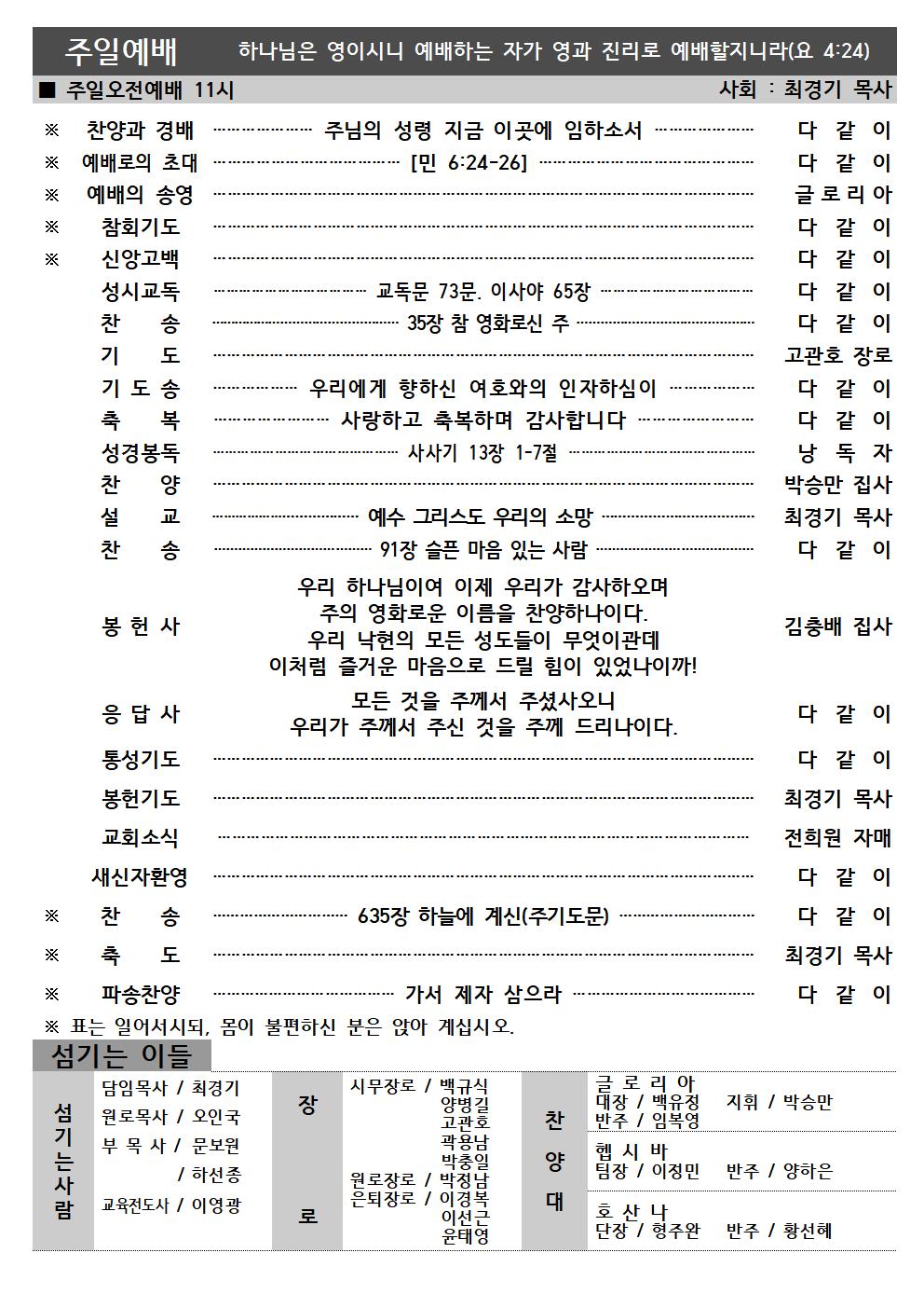 »õ·Î¿î 50³â, ¡®¿¬ÇÑ ¼ø°°ÀÌ¡¯ (Soli Deo Gloria) 1¿ù - ¡°ÀºÇý¿Í °¨»ç ±×¸®°í ¼Ò¸Á¡± | ÀÏ ½Ã | ¿¹¹è ¹× Çà»ç | ȸÀÇ ¹× ¿ù·Êȸ | 1¿ù 23ÀÏ | | ´çȸ | 1¿ù 30ÀÏ | û³âºÎ¿Í ÇÔ²²ÇÏ´Â Âù¾ç¿¹¹è | | 2¿ù 6ÀÏ | 70ÀÏ »õº®±âµµÈ¸(4¿ù17ÀϱîÁö) | ÇѳªÈ¸, Á¦3³²ÀüµµÈ¸, Á¦4¿©ÀüµµÈ¸ ±³À°À§¿øÈ¸ | 2¿ù 13ÀÏ | | Á¦Á÷ȸ, Á¦1¿©ÀüµµÈ¸ |