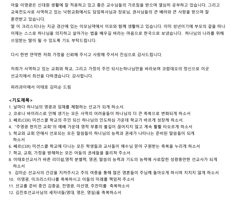 ÇϼҼ 9. ±è¹Ì¼ø ¼±±³»çÀÇ °Ç°À» ÁöÄÑÁֽðí ÁÖÀÇ ¿©Á¾À» ÅëÇØ ¸¹Àº ¿µÈ¥µéÀÌ ÁÖ´Ô²² µ¹¾Æ¿À°Ô ÇϽøç ÁöÄ¡Áö ¾Ê°Ô ÇϼҼ 10. ÀÌ¿µ±¤, ÀÌÅ©¸®½ºÆ¼³ª¸¦ ÃູÇϽðí À̵éÀÇ ¹Ì·¡¸¦ Ã¥ÀÓÁ® ÁÖ¼Ò¼ 11. ¼±±³¸¦ Áغñ ÁßÀÎ ±èÁ¾À±, Àü¿µ±¤, À̼±¿µ, ÁÖÂù¹Ì¸¦ ÃູÇϼҼ 12. ±èÁøÈ£¼±±³»ç´ÔÀÇ ¼¼ÀÚ³àµé(¿µ´ë, ¿µÀº, ¿µ½Ç)À» ÃູÇϼÒtj