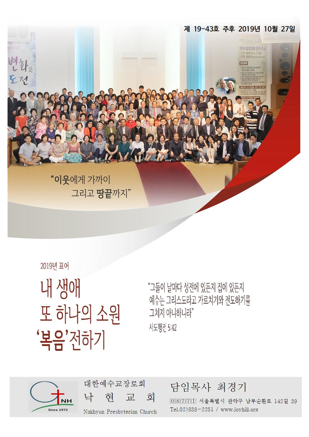 ¡Ø ±¤ °í 1. Á¾±³°³ÇõÁÖÀÏ ÀÏÀÏ Áýȸ *. ÀϽà : 11¿ù 3ÀÏ(ÁÖÀÏ) ¿ÀÀü 11½Ã, ¿ÀÈÄ 2½Ã *. °»ç ; Ȳ´ë¿ì ¸ñ»ç(°í½Å´ëÇб³ ±³¼ö) *. ÀºÇý¸¦ »ç¸ðÇÏ¸ç ±âµµÇÏ¸é¼ ÁغñÇϽñ⠹ٶø´Ï´Ù. 2. 11¿ù ù ÁÖÀÏ(11¿ù 3ÀÏ) ¿¹¹è *. »õº®±âµµÈ¸ : Àü °¡Á· »õº®±âµµÈ¸(¿ÀÀü 5½Ã) *. 11½Ã ¿¹¹è : ¿Â °¡Á·ÀÌ ÇÔ²² ÇÏ´Â ¿¹¹è 3. ¸ñÀå ¿¬ÇÕ ¿¹¹è *. 11¿ù 10ÀÏ(ÁÖÀÏ) ¿ÀÈÄ 2½Ã *. ±³È¸ ÁÖº¯ Àüµµ´Â °í°üÈ£ Àå·Î´Ô ±³±¸ÀÔ´Ï´Ù. 4. ÀϺ» ±èÄ¡ ¼±±³ *. ÀÏÁ¤ : 11¿ù 6ÀÏ(¼ö)~9ÀÏ(Åä) *. Àå¼Ò : ¿À»çÄ« º¦¿¤±³È¸(À̽ÅÇü ¼±±³»ç) *. ¿À´Ã ±èÄ¡ ¼±±³¸¦ À§ÇÑ Çå±ÝÀÌ ÀÖ½À´Ï´Ù. 5. 2019³â ÇÑ »ý¸í ÀüµµÁÖÀÏ *. ÀϽà : 11¿ù 17ÀÏ(Ãß¼ö°¨»çÁÖÀÏ) *. ¿ÃÇØ ¸ñÇ¥´Â ¡®1ÀÎ 1¸í 3ÁÖ ¿¬¼Ó Ãâ¼®½ÃŰ±â¡¯ÀÔ´Ï´Ù. *. ±âµµÇÏ¸é¼ ÇÑ ºÐÀÌ ÇÑ ¸í¾¿ ²À ÀüµµÇϽñ⠹ٶø´Ï´Ù. *. ŽÅÀÚ ¸í´ÜÀº ÀÛÁ¤ÇϽô ´ë·Î Á¦ÃâÇØ Áֽñ⠹ٶø´Ï´Ù. 6. ÇϹݱâ ÇнÀ, ¼¼·ÊÀÚ ¸ðÁý *. ¼º·Ê½Ä : 11¿ù 24ÀÏ(ÁÖÀÏ ¿ÀÀü) *. ÇнÀ°ú ¼¼·Ê ´ë»óÀÚµéÀº »ç¹«½Ç·Î ½Åû¹Ù¶ø´Ï´Ù. 7. »õº®±âµµÈ¸(ÁÖÀÏ~±Ý¿äÀÏ ¿ÀÀü 5½Ã) *. »õº®À» ±ú¿ö ¿µÀûÀ¸·Î °°ÇÇÑ »îÀ» »ç½Ã±â ¹Ù¶ø´Ï´Ù. *. Åä¿äÀÏ »õº®Àº °ø½ÄÀûÀÎ ±âµµÈ¸´Â ¾øÁö¸¸ °³ÀÎÀûÀ¸·Î ±âµµÇÏ½Ç ºÐµéÀº º»´ç¿¡¼ ±âµµÇϽñ⠹ٶø´Ï´Ù. 8. ±Ý¿ä ±âµµÈ¸(¸ÅÁÖ ±Ý¿äÀÏ Àú³á 8½Ã) *. ±Ý¿ä±âµµÈ¸´Â °¡Á¤°ú ±³È¸, ³ª¶ó¿Í ¹ÎÁ·À» À§ÇÑ ±âµµ½Ã°£ÀÔ´Ï´Ù. *. À̹øÁÖ Âù¾çÀº ÆÄ¶ó°úÀÌ1 ¸ñÀåÀÔ´Ï´Ù. 9. ÀÛÀº ¸ñÀÚ ¸ðÀÓ *. ¼ö¿ä ¿¹¹è ÈÄ¿¡ ÀÛÀº ¸ñÀÚ °øºÎ ÀÖ½À´Ï´Ù. *. Á¤±âÀûÀ¸·Î ¿ÀÈÄ ¿¹¹è ÈÄ¿¡ ¸ðÀÔ´Ï´Ù. *. ´ã´ç ±³¿ªÀÚ, ±³±¸ Àå·Î´Ô, °ü¸® ´ã´çÀÚ, ÀÛÀº ¸ñÀÚ ¸ðÀÓÀÔ´Ï´Ù. 10.2019³â °¡À» Á¤±â ½É¹æ(10¿ù~11¿ù) *. °¡À» °¡Á¤ ½É¹æÀ» ½Ç½ÃÇÕ´Ï´Ù. *. °¡Á¤º°·Î ´ã´ç ±³¿ªÀÚ¿¡°Ô ¾Ë·ÁÁֽñ⠹ٶø´Ï´Ù. 11.2Çб⠼º°æ°øºÎ ¹× ±âµµÈ¸ *. È¿ä ±Ç»ç ±âµµÈ¸ : È¿äÀÏ ¿ÀÀü 11½Ã *. ÁÖÀÏ ¼º°æ°øºÎ : ¸Å ÁÖÀÏ ¿ÀÀü 10½Ã *. È¿ä ¹× ¸ñ¿ä ¼º°æ°øºÎ : È¿äÀÏ ¿ÀÀü 10½Ã 30ºÐ, ¸ñ¿äÀÏ Àú³á 7½Ã 30ºÐ 12.ÀÌ¿ôµ½±â ¹× ¼±±³¸¦ À§ÇÑ »ç¶ûÀÇ ¹ÙÀÚȸ *. ¼ö°íÇϽЏðµç ºÐµé²² Áø½ÉÀ¸·Î °¨»çµå¸³´Ï´Ù. 13.±³È¸ ¹× ±³¿ì¼Ò½Ä *. ±³È¸°¡ ¼¼¿î °èȹ¿¡ °ü½ÉÀ» °¡Áö°í ±âµµÇØ Áֽñ⠹ٶø´Ï´Ù. *. Ä¡·á Áß¿¡ Àְųª ÀÔ¿øÇØ ÀÖ´Â ¼ºµµµé, ¾î·Á¿ò Áß¿¡ ÀÖ´Â ¼ºµµµéÀ» À§ÇØ ±âµµÇØ Áֽñ⠹ٶø´Ï´Ù. *. °áÈ¥ : ¹Ú¼ºÈñ ¾ç(
